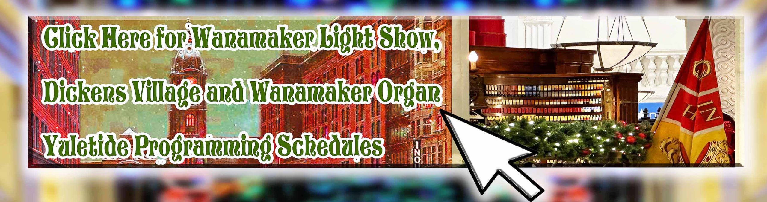 MUCH EXCITING NEWS! THE PHILADELPHIA VISITOR CENTER IS SPEARHEADING A FUND-RAISER TO PRESENT THE ATTRACTIONS ABOVE WITH THE WANAMAKER ORGAN. PLEASE CONSIDER A GENEROUS CONTRIBUTION! WE FULLY EXPECT THE WANAMAKER ORGAN TO BE PLAYED SEVERAL TIMES A DAY DURING THE HOLIDAY SEASON THROUGH CHRISTMAS EVE, IN CONJUNCTION WITH THE LIGHT SHOW AND DICKENS VILLAGE. AN INQUIRER ARTICLE ON THE FUTURE OF THE LIGHT SHOW AND THE URGENT NEED FOR GRASSROOTS SUPPORT IS HERE.