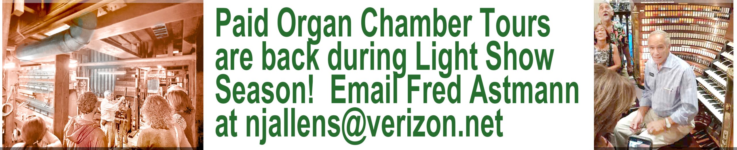 We are again offering Organ Chamber and Restoration Studio paid tours during the 2025 Light Show season. Contact Fred Astmann at njallens@verizon.net for details!